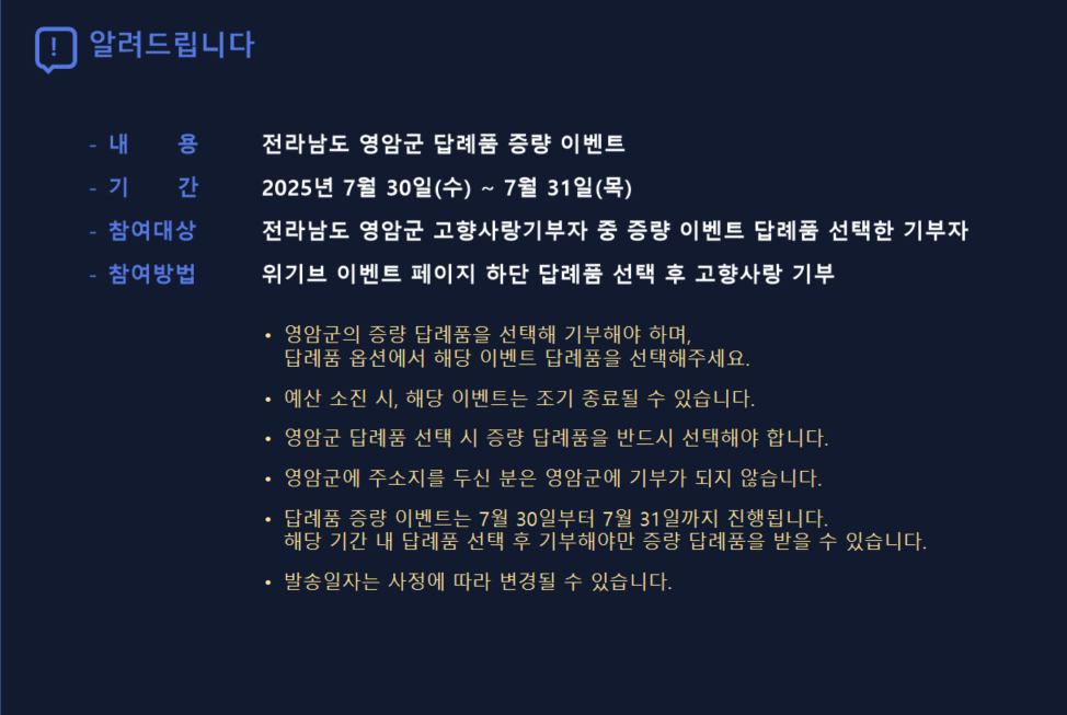 - [전남 영암] 고향사랑기부하고 한우 더 받자!
