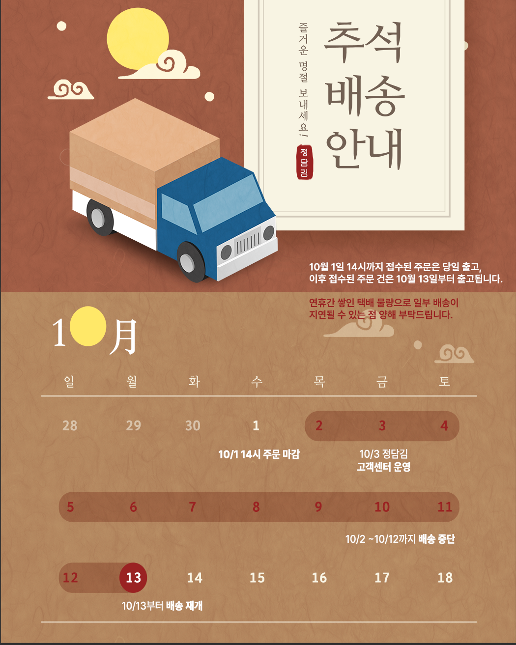 연휴 기간이 길어 배송 일정에 차질이 없도록 꼭 참고 부탁드립니다.