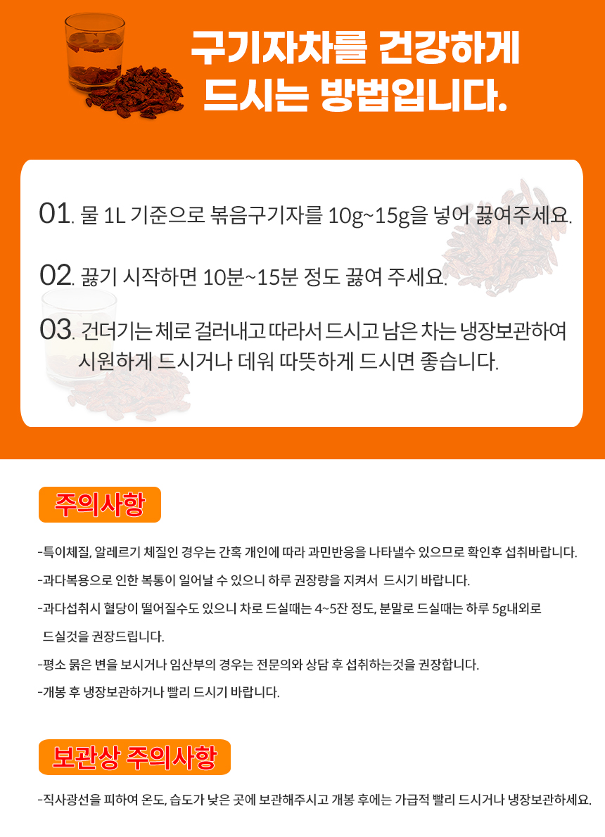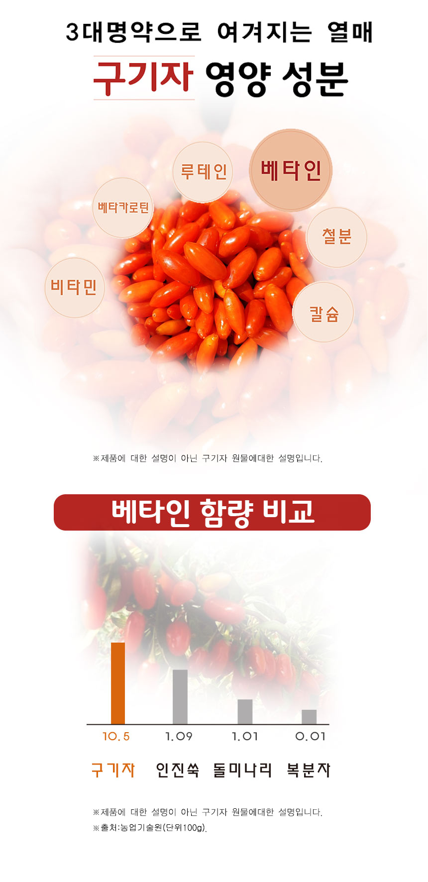 | 원재료명 (「농수산물의 원산지 표시 등에 관한 법률」에 따른 원산지 표시 포함) 및 함량(원재료 함량 표시대상 식품에 한함) | 청양유기농구기자열매 100% |