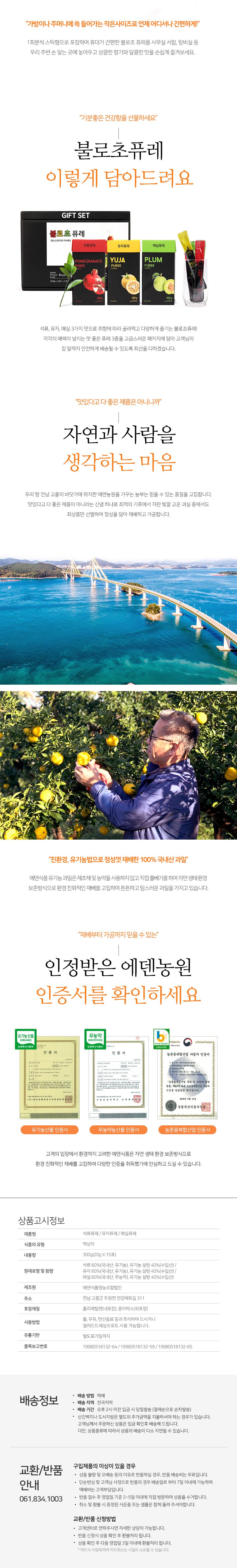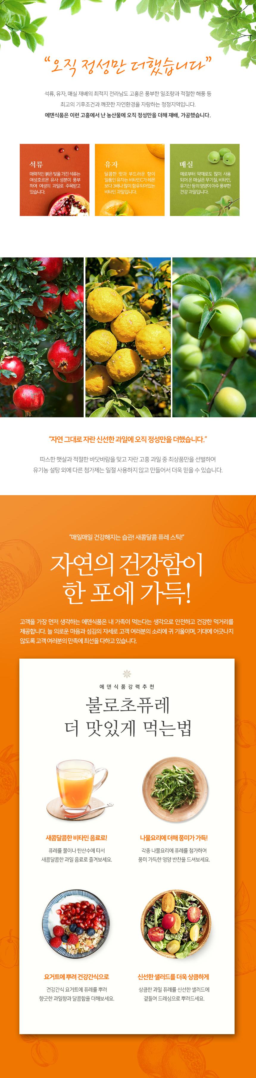 | 원료명 및 함량 (「농수산물의 원산지 표시 등에 관한 법률」에 따른 원산지 표시 포함) | 상품페이석류 60%, 유자 60%, 매실 60% (국내산) / 유기농 설탕 40% (수입산) |