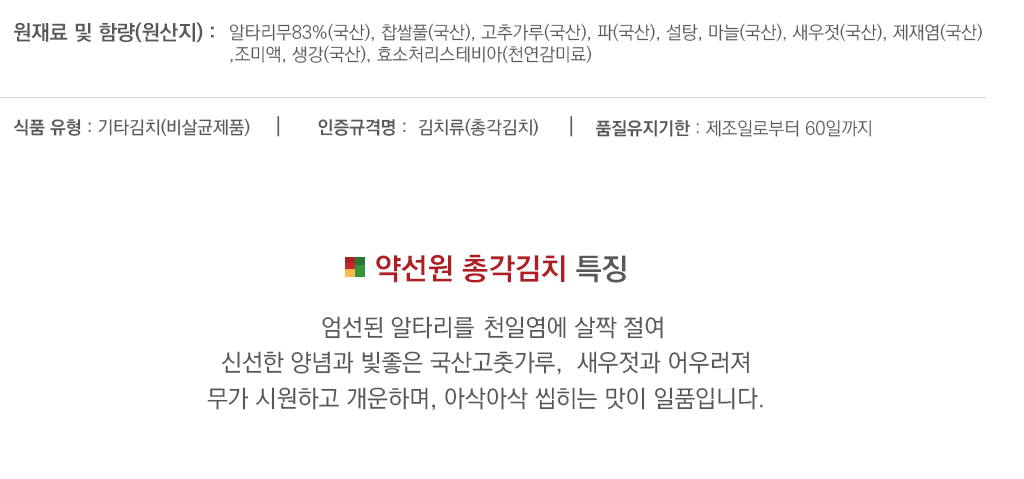 | 원재료명 (「농수산물의 원산지 표시 등에 관한 법률」에 따른 원산지 표시 포함) 및 함량(원재료 함량 표시대상 식품에 한함) | 상세정보 별도표기 |