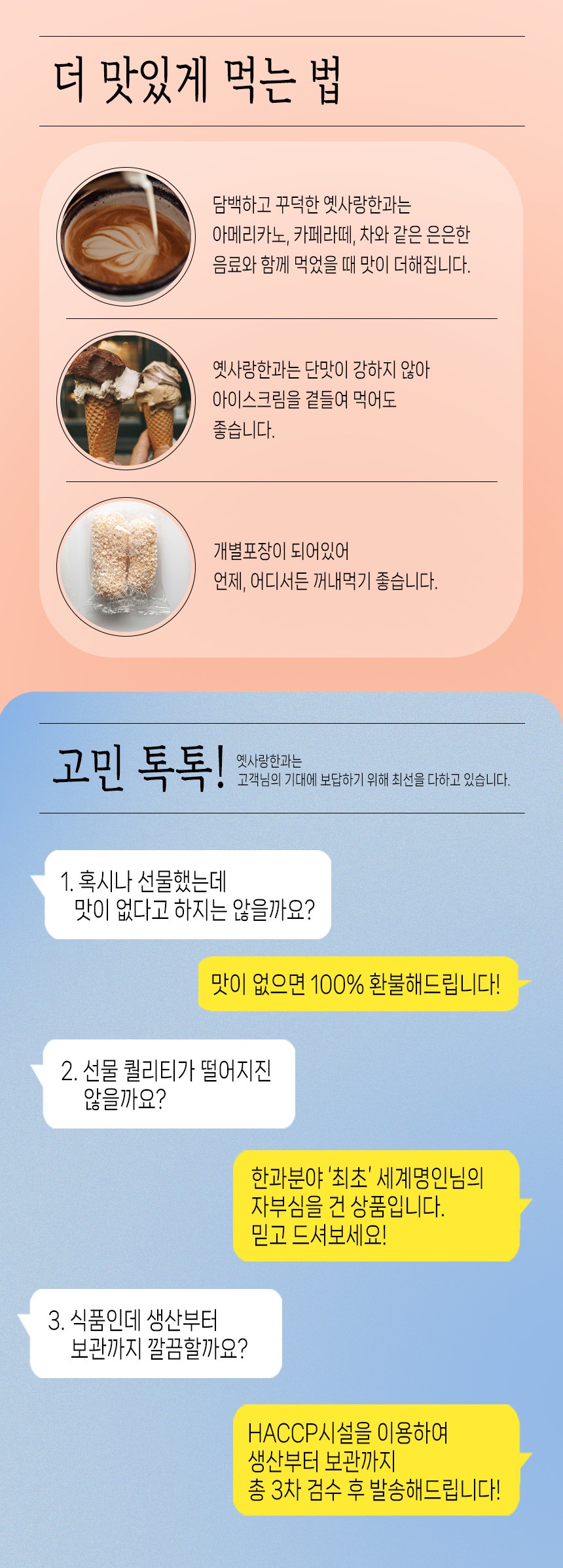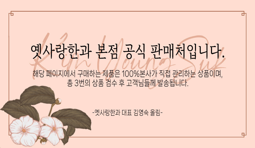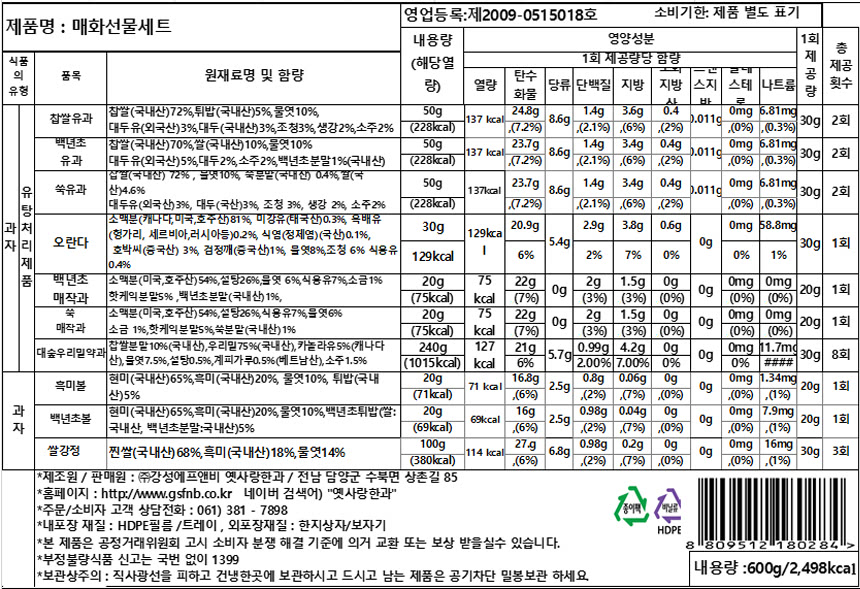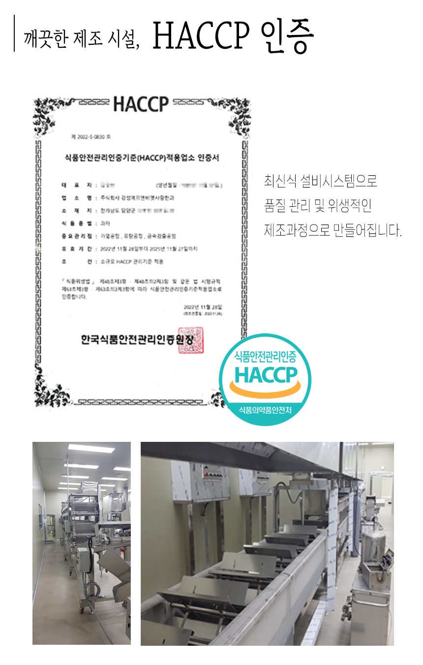 | 생산자 및 소재지(수입품의 경우 생산자, 수입자 및 제조국) | 전남 담양군 수북면 상촌길 85 / (주)강성에프엔비 옛사랑한과 |