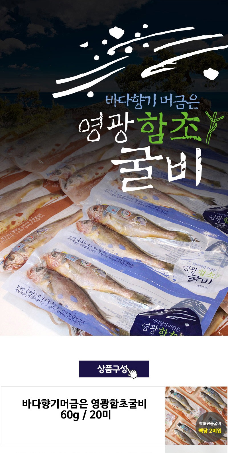 | 상품구성 | 함초굴비 (마리당60g*10미) * 2팩, 더덕고추장굴비 100g *1팩 |