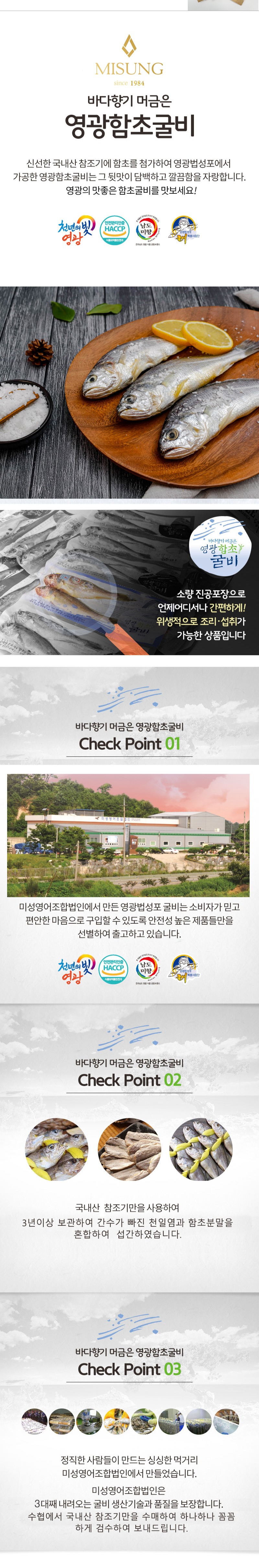 | 원산지 | 함초굴비 : 참조기(국산), 천일염(국산), 함초분말(국산) 더덕고추장굴비 : 굴비(국산), 고추장(국내산), 더덕분말(국산), 양념(국내산) |