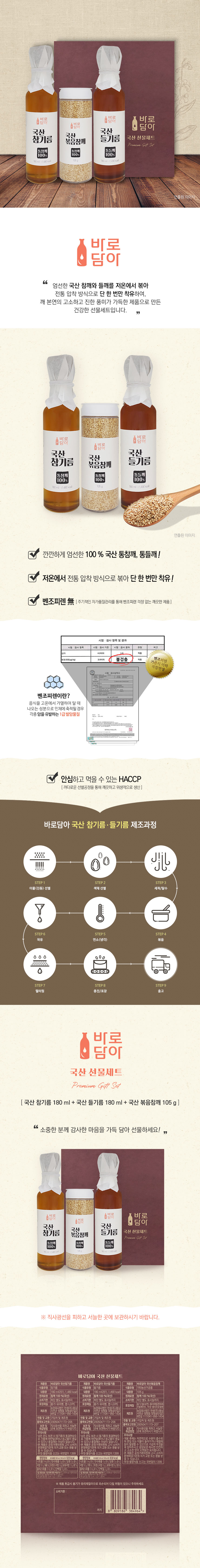 바로담아 국산유지세트(참기름, 들기름 각 180ml+볶음참깨105g)