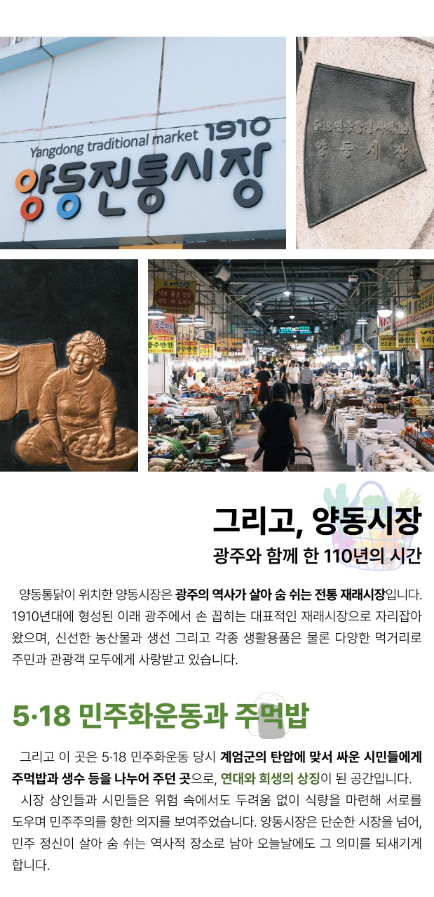 광주광역시의 중심에 우뚝 선 광주 서구. 광주광역시청과 광주 교통의 요충지 종합버스터미널, 그리고 월드컵 4강 신화를 쓴 광주월드컵경기장까지 전부 광주 서구에 위치해 있습니다. 또한 광주 서구에서는 아름다운 자연풍경과 문화유산을 골고루 살펴볼 수 있는 서구 8경이 있어 관광객들에게 보다 알찬 추억을 선사합니다. 마지막으로 100년 전통의 양동시장은 꼭 방문해보시길 바랍니다. 호남지역의 최대 재래시장인 양동시장은 다채로운 먹거리로 여러분의 입을 더욱 즐겁게 만들어드릴 거랍니다.