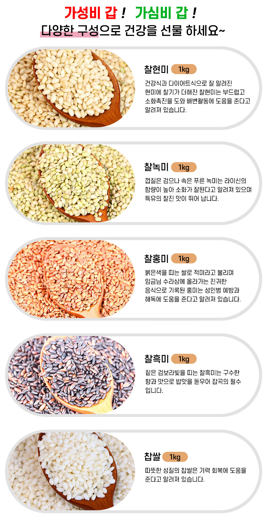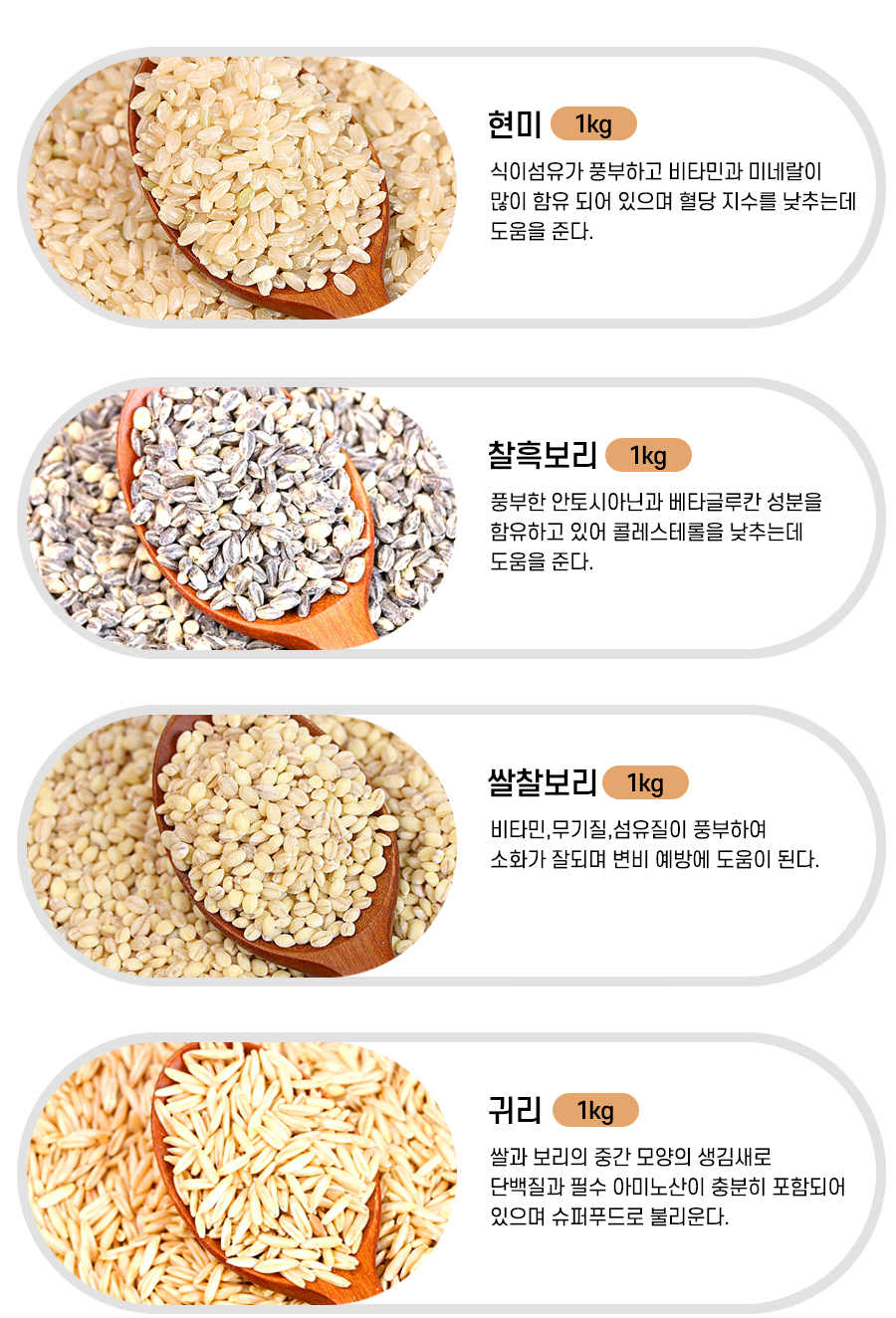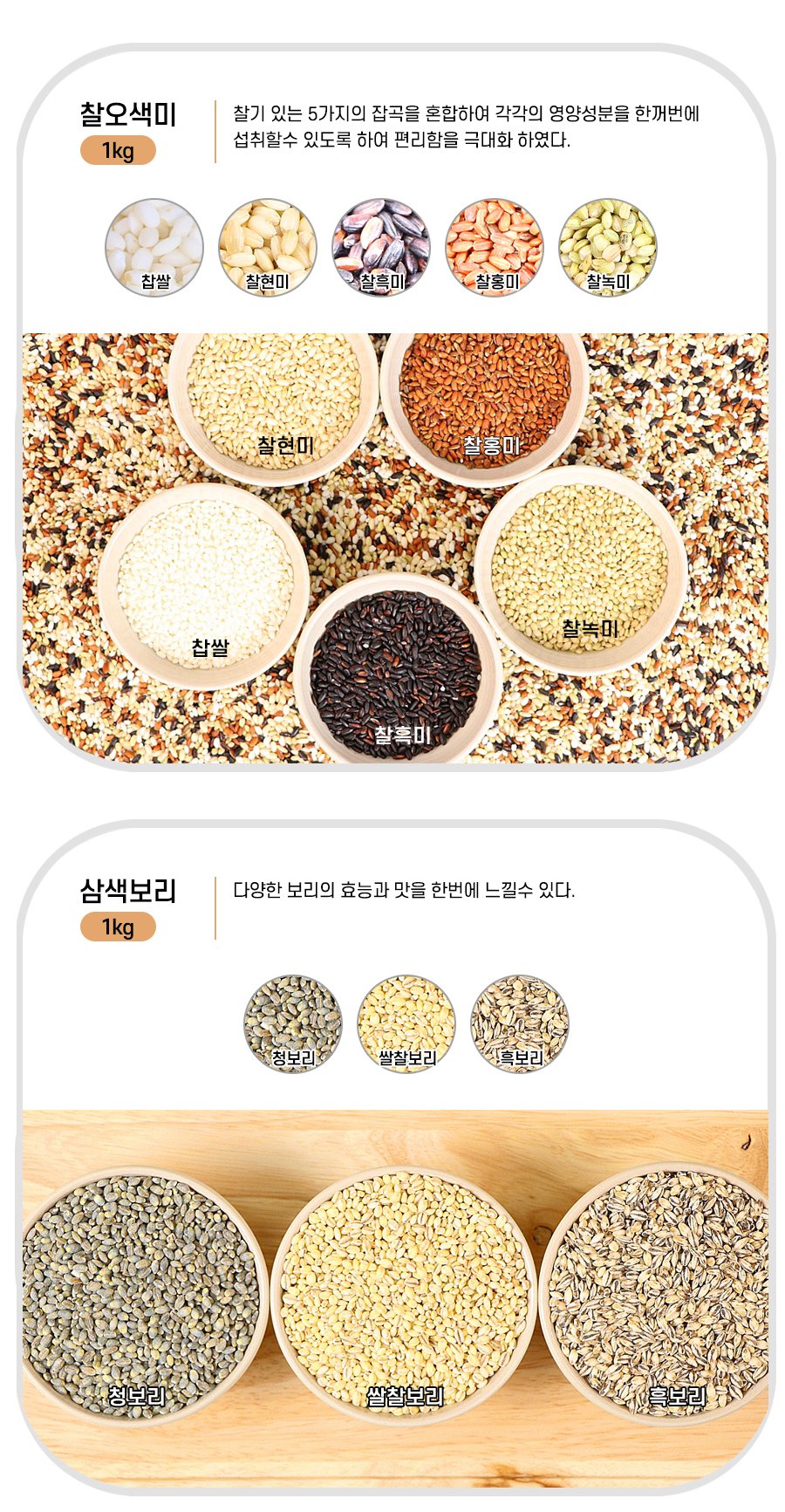 | 상품구성 | 혼합17곡 1kg , 찰오색미 1kg, 삼색보리 1kg |