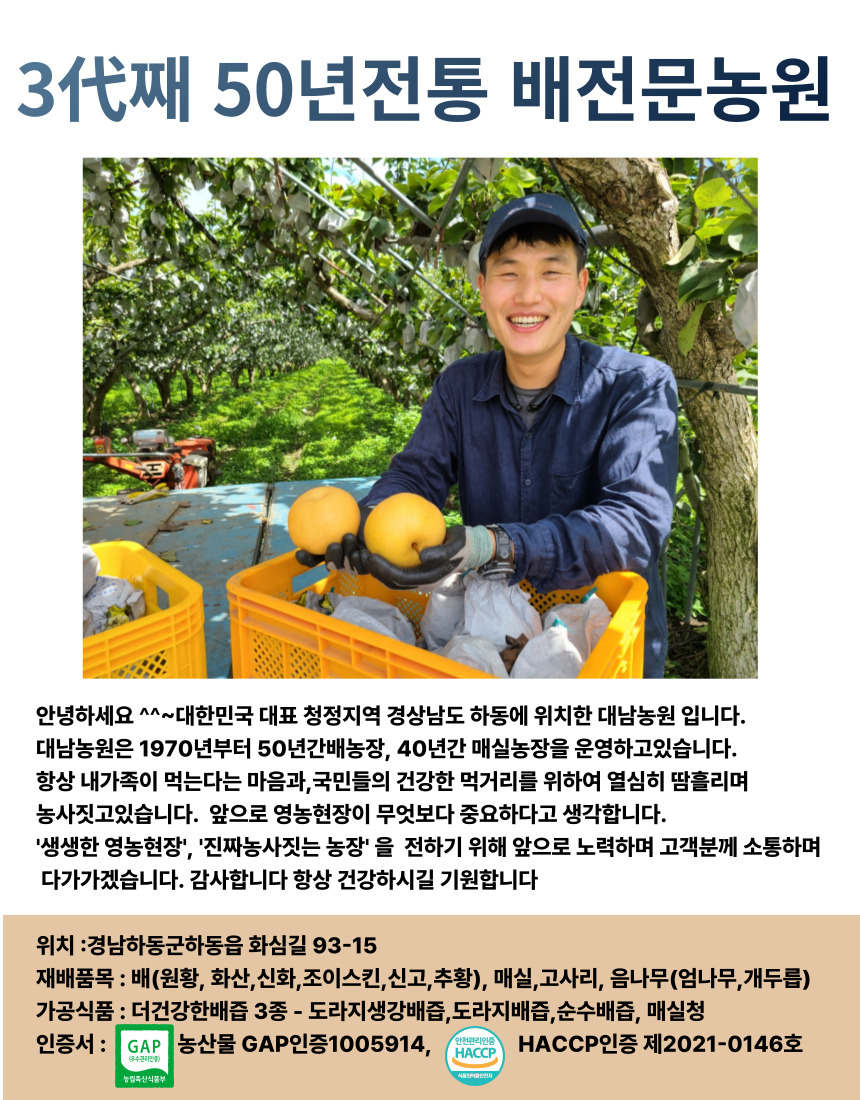 40년축적된 배재배기술로 가장맛이좋을떄 수확하여 물많고 당도좋은배로