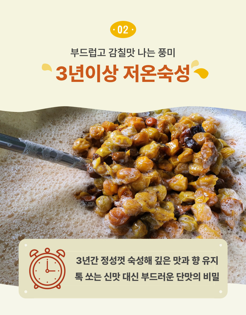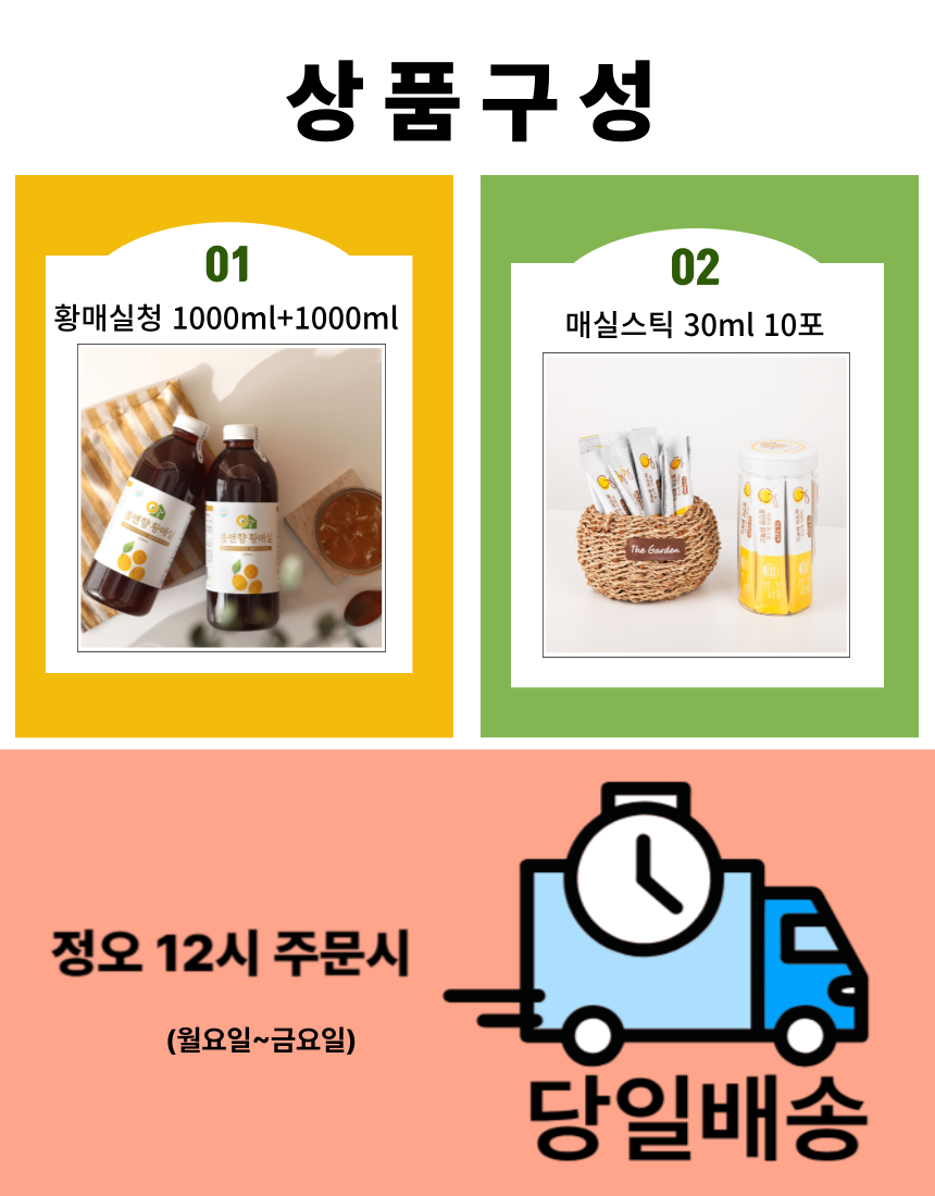 | 소비자 안전을 위한 주의사항 | 1. 본 제품은 농축된 황매실 원액으로, 권장 희석 비율 (물 또는 탄산수 1:4~1:5) 또는 기호에 따라 희석하여 음용하십시오. 2. 직사광선을 피해 서늘하고 건조한 곳에 보관하십시오. 3. 침전물이 생길 수 있으나, 이는 황매실의 천연 성분이므로 안심하고 흔들어 드십시오. 4. 당알코올, 인공감미료, 보존료를 첨가하지 않았으며, 원물의 당류가 농축되어 당뇨 등 건강에 민감하신 분은 섭취 전 전문가와 상담하십시오. 5. 어린이, 임산부, 특이 체질 |