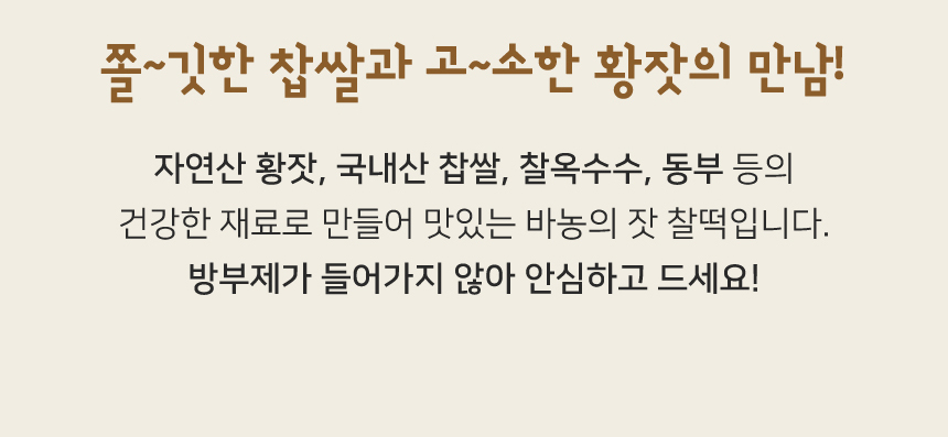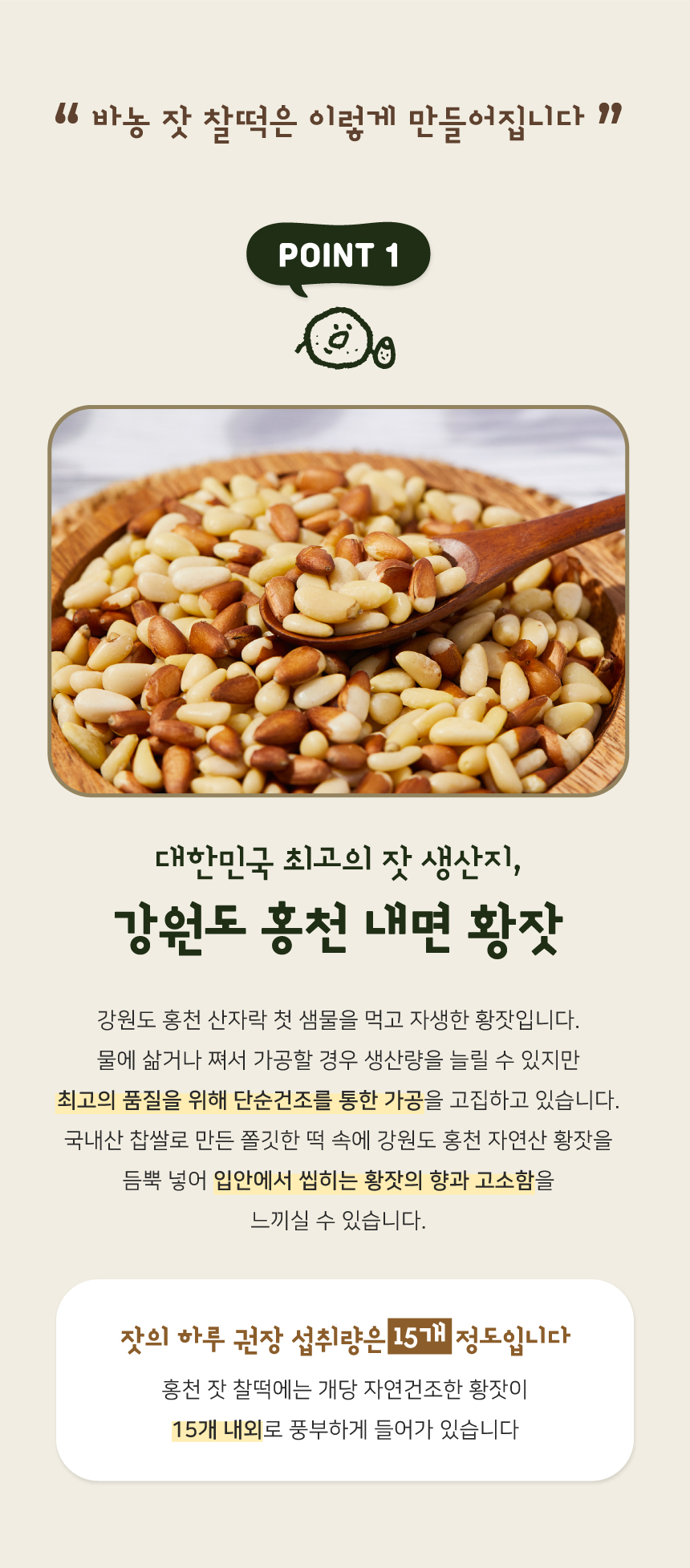 | 원재료명 및 함량 | 잣(국내산:홍천)20%,찹쌀(국내산)50%,옥수수(국내산)3%,동부(미얀마)20%,저당물엿4.5%,정제당2.5% |