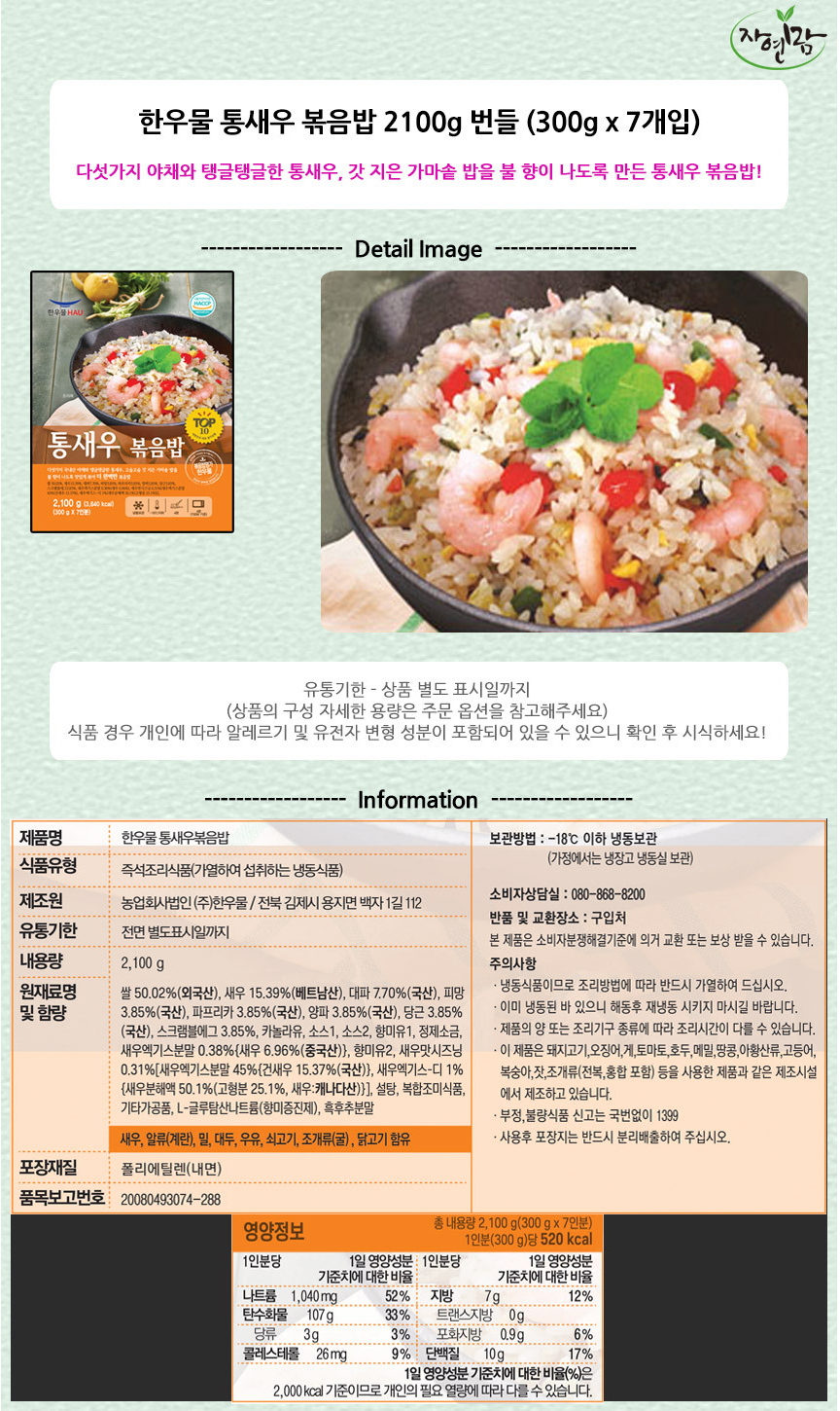 | 포장단위별 내용물의 용량(중량), 수량 | 통새우볶음밥 300g*7 / 유기농 곤드레나물밥 262g*5 |