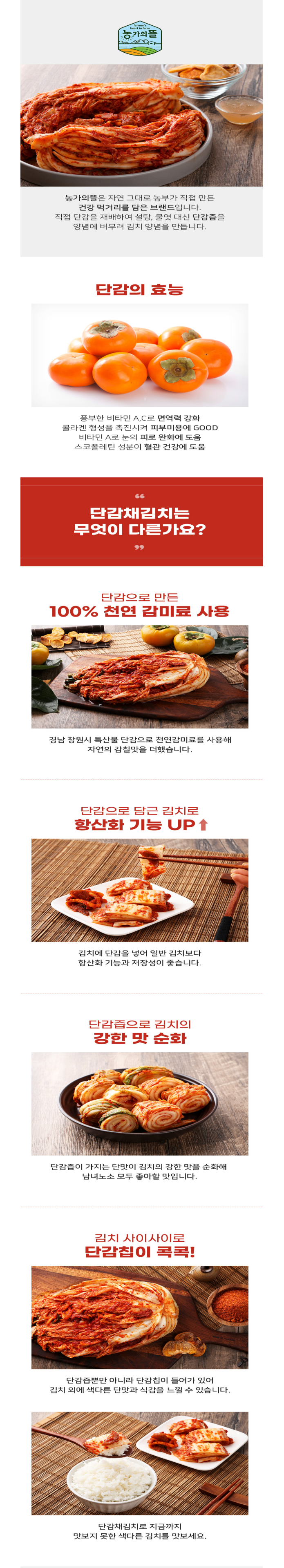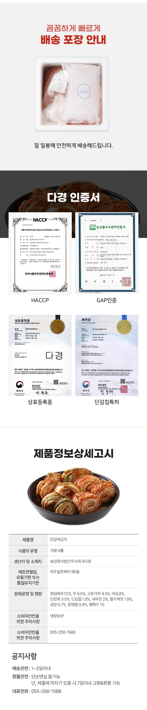 | 원재료명 및 함량 | 절임배추72%, 무9.5%, 고춧가루 4.5%, 마늘3%, 단감채3.5%, 단감즙1.5%, 새우젓2%, 멸치액젓1.9%, 생강0.7%, 정제염0.4%, 팽화미1% |