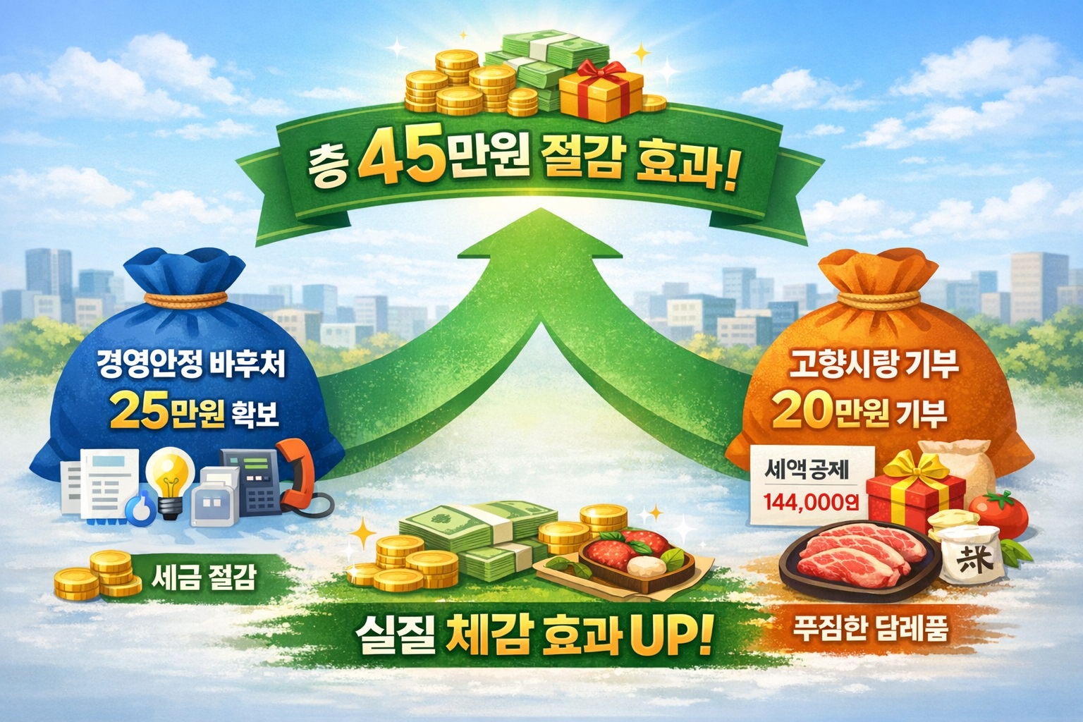 경영안정 바우처로 25만 원을 확보하고, 고향사랑기부 20만 원을 전략적으로 활용한다면 총 45만 원 규모의 현금 흐름 개선 효과를 기대할 수 있습니다.