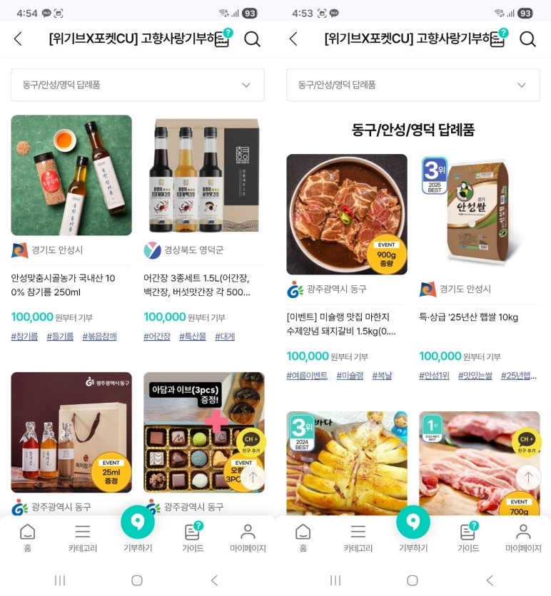 내가 기부한 광주 동구는 포켓 CU 앱 > 위기브로 접속해 기부하면 CU 모바일 상품권 1만원이 추가로 제공됨.