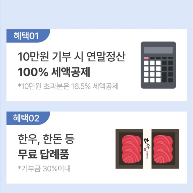 1️⃣ 100% 환급 혜택: 10만 원 기부 시 전액 세액공제와 3만 원 상당의 답례품을 더해 기부금 이상의 이득