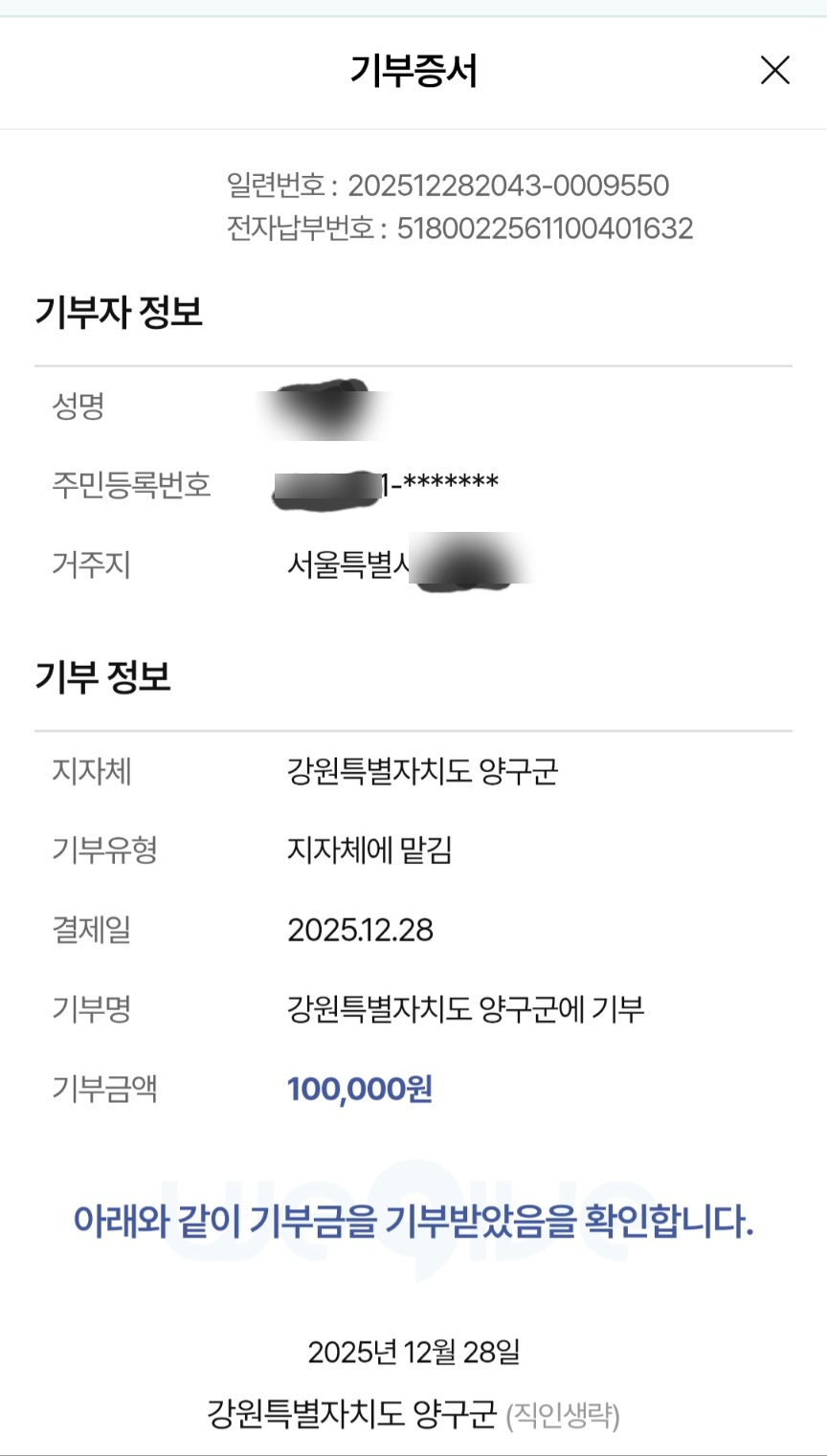 1️⃣ 강원특별자치도 양구군에 고향사랑기부제를 통해 기부하고 연말정산 10만 원 전액 세액공제 혜택을 받았다.