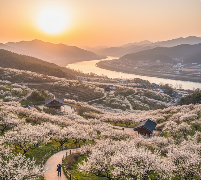 광양 매화마을이 특별한 이유는 단순히 꽃의 양 때문만은 아닙니다. 섬진강을 따라 흐르는 물길, 완만한 언덕, 전통 가옥과 돌담, 그리고 그 사이를 채운 매화나무들이 어우러지며 마치 한 폭의 수묵화를 보는 듯한 풍경을 만들어냅니다. 특히 이른 아침 안개가 옅게 깔린 시간이나, 노을이 매화 위로 내려앉는 순간은 사진보다 눈으로 담아야 할 장면으로 남습니다.