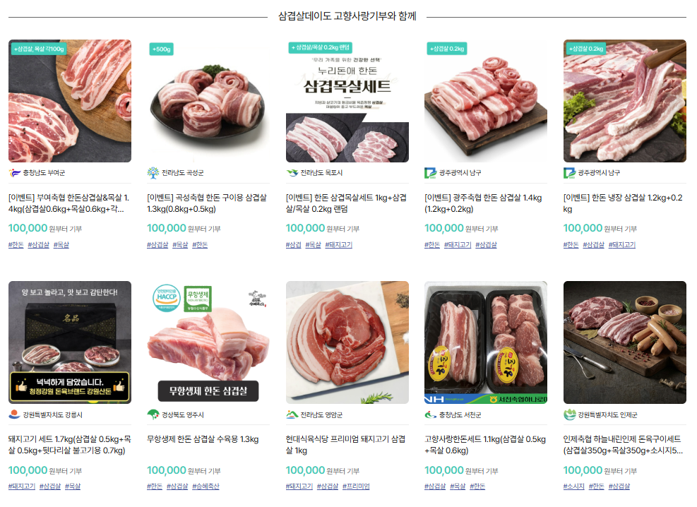 현재 위기브에서는 삼겹살데이를 맞아 기간 한정 기획전을 진행하고 있는데, 단순히 고기를 구매하는 것이 아니라 기부를 통해 삼겹살이나 한돈 세트 같은 지역 특산 답례품을 받을 수 있는 구조로 운영되고 있습니다.