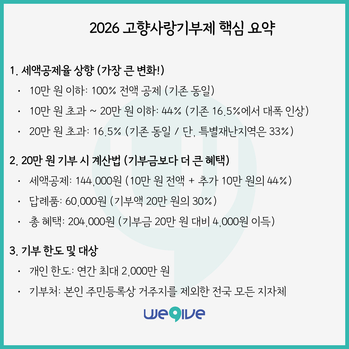 2026년부터 고향사랑기부제 세액공제 구간이 확대되면서 20만 원 구간까지 전략적으로 활용할 수 있게 되었습니다.