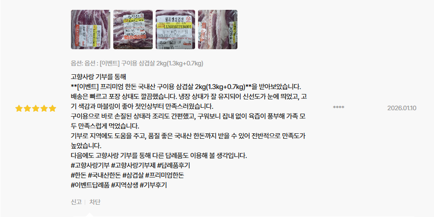 그래서인지 단순히 ‘고기 한 팩’이 아니라, 구이용 + 찌개용, 수육용 등으로 다양하게 먹을 수 있는 실용적인 구성이라는 평가가 이어집니다.