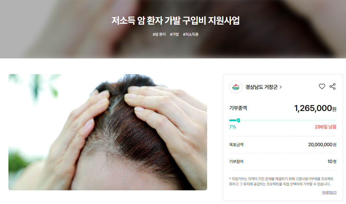 이번 지정기부는 경제적 부담 때문에 가발 구입을 망설이는 저소득 암 환자들을 위해 가발 구입비를 지원하는 사업입니다.
