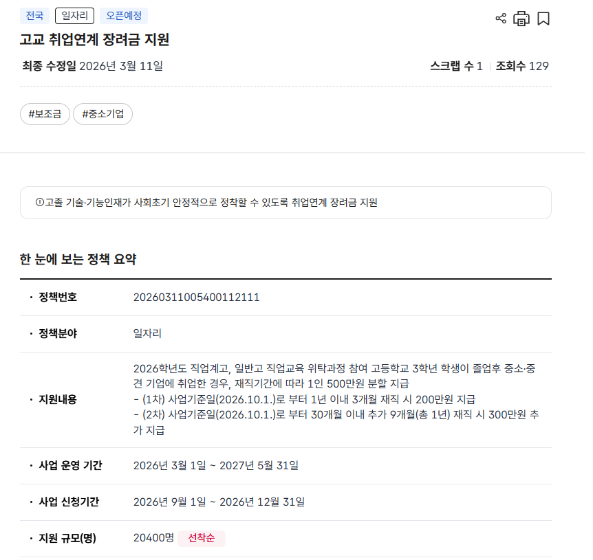 고교 취업연계 장려금 지원, 청년의 첫걸음을 응원하는 제도