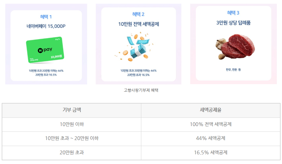 기부자는 연말정산 또는 종합소득세 신고 시 세액공제 혜택을 받을 수 있습니다. 특히 10만원까지 전액 세액공제가 가능해 실질적인 부담이 거의 없다는 부분이 큰 장점으로 뽑히고 있습니다. 고향사랑 기부제 기부는 다양한 플랫폼에서 진행할 수 있으며, 지역별 특산품 등 다양한 답례품을 선택하여 받을 수 있는 부분도 참여 만족도를 높여주는 부분 중 하나입니다.