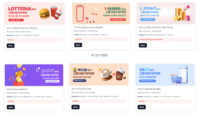 추가로 위기브에서는 고향사항기부제 기부 이벤트를 다양한 기업들과 진행하여 추가적인 혜택을 제공하고 있었습니다.