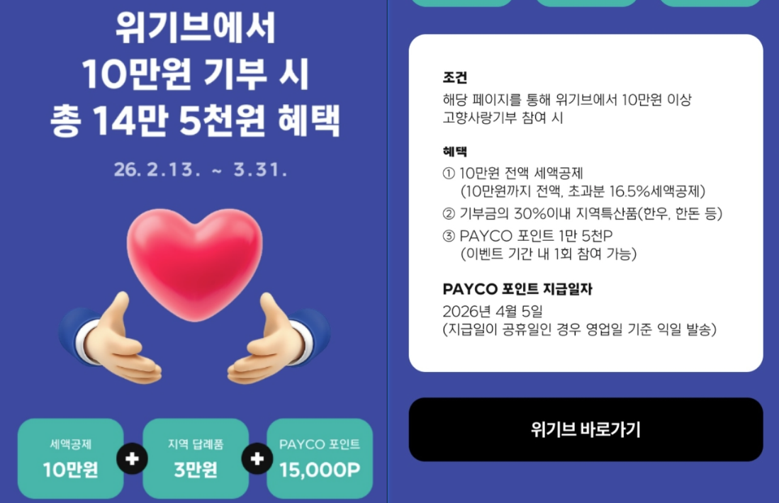 원본 보러가기 ▶ 위기브 고향사랑기부제 세액공제 및 양념돼지구이 답례품(최대 14만 5천원 혜택)