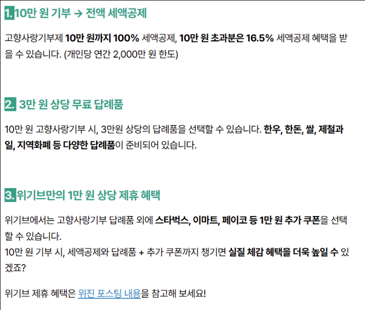 고향사랑기부제는 10만 원 기부로 13만 원 이상의 가치를 돌려받을 수 있어 직장인에게는 안 하면 손해인 제도입니다.