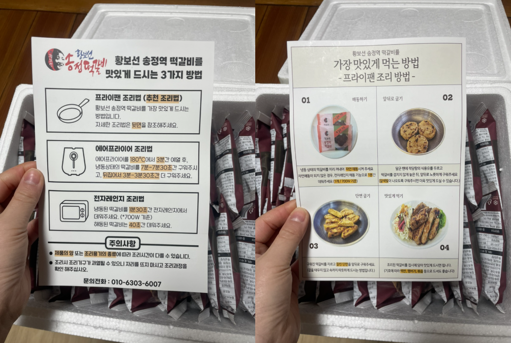 박스를 열어보니 포장이 정말 꼼꼼하더라고요. 특히 안에 '송정역 떡갈비 맛있게 드시는 방법'이 적힌 리플렛이 동봉되어 있어서 감동! 프라이팬, 에어프라이어, 전자레인지별로 상세하게 적혀있어서 요리 초보도 걱정 없겠더라고요.