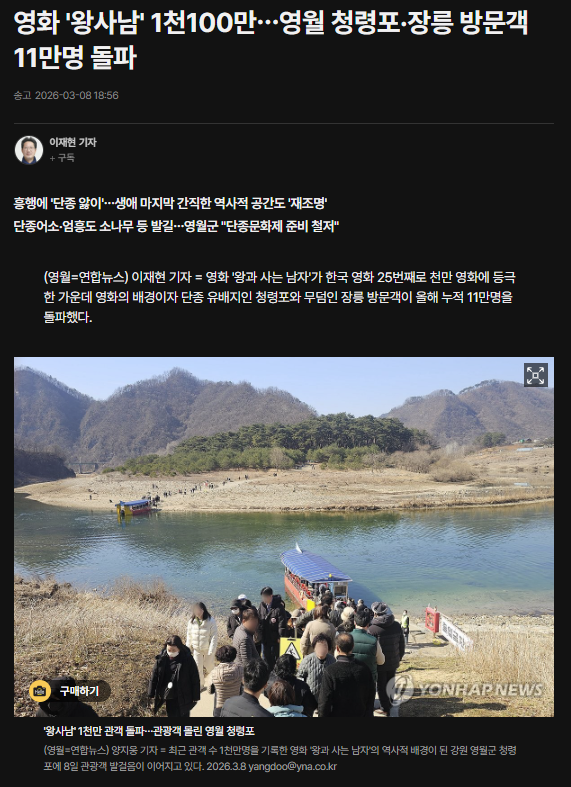 연합뉴스는 이 영화가 1,500만 관객을 돌파한 뒤 청령포 들판에서 열린 지역 행사까지 성황을 이뤘다고 전했고, 한겨레는 영화 개봉 이후 청령포와 장릉 방문객이 전년 같은 기간보다 크게 늘었다고 보도했습니다.